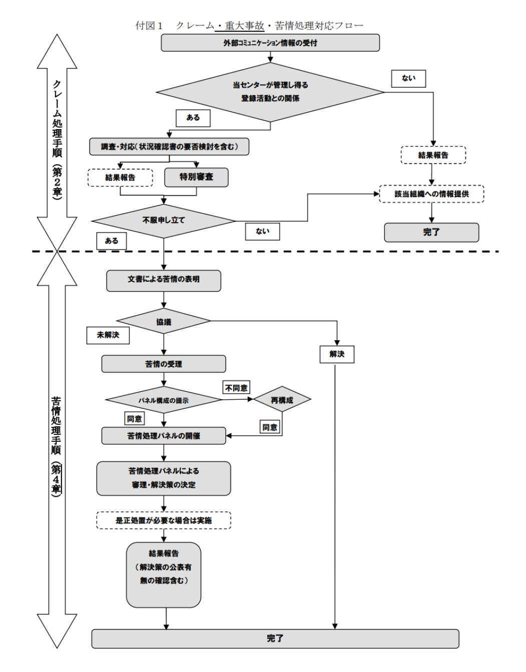 「苦情処理パネル」のメンバー構成については、「苦情」を申立てた方に異議を述べる権利があります。また、申立者は苦情申立て内容について、「苦情処理パネル」の場で説明することができます。詳細な手順については、当センターの「外部コミュニケーション対応規定」に従い、以下の通り実施いたします。