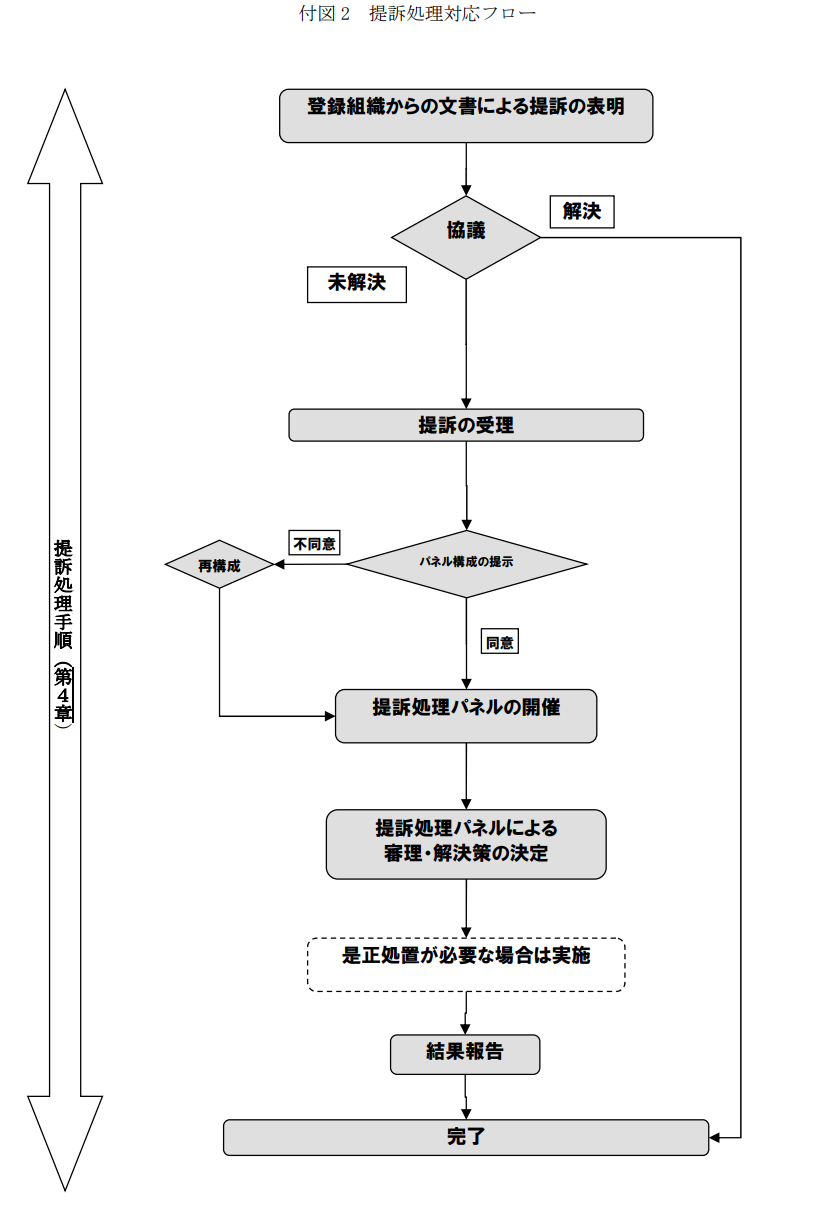 | 「提訴」 | 当センターが実施した組織に対する登録、登録維持または更新登録の可否決定ならびに登録一時停止、登録取消しの決定等、センターの決定事項について、その当該組織が公式に文書で提出した申立てを言います。 |